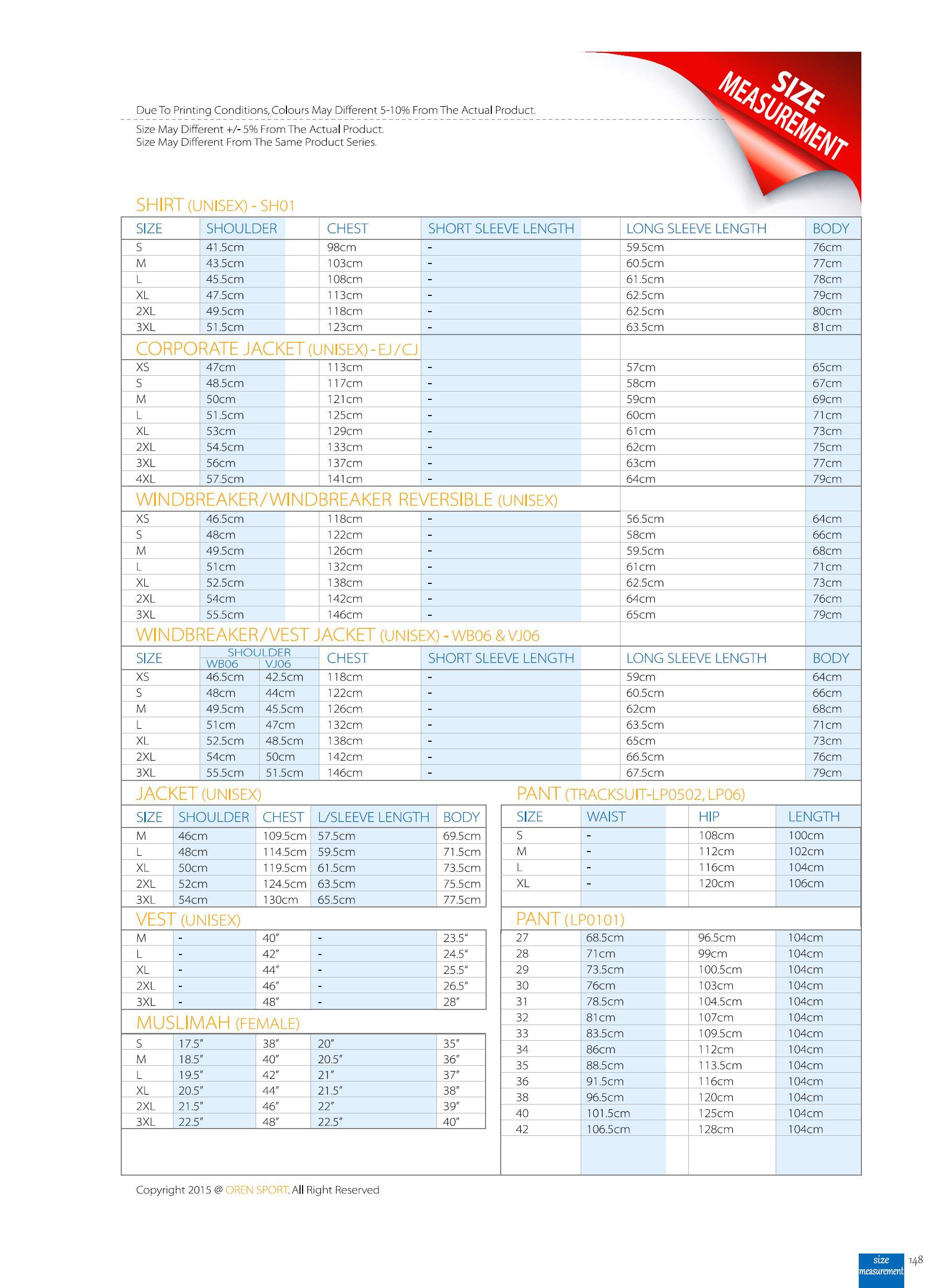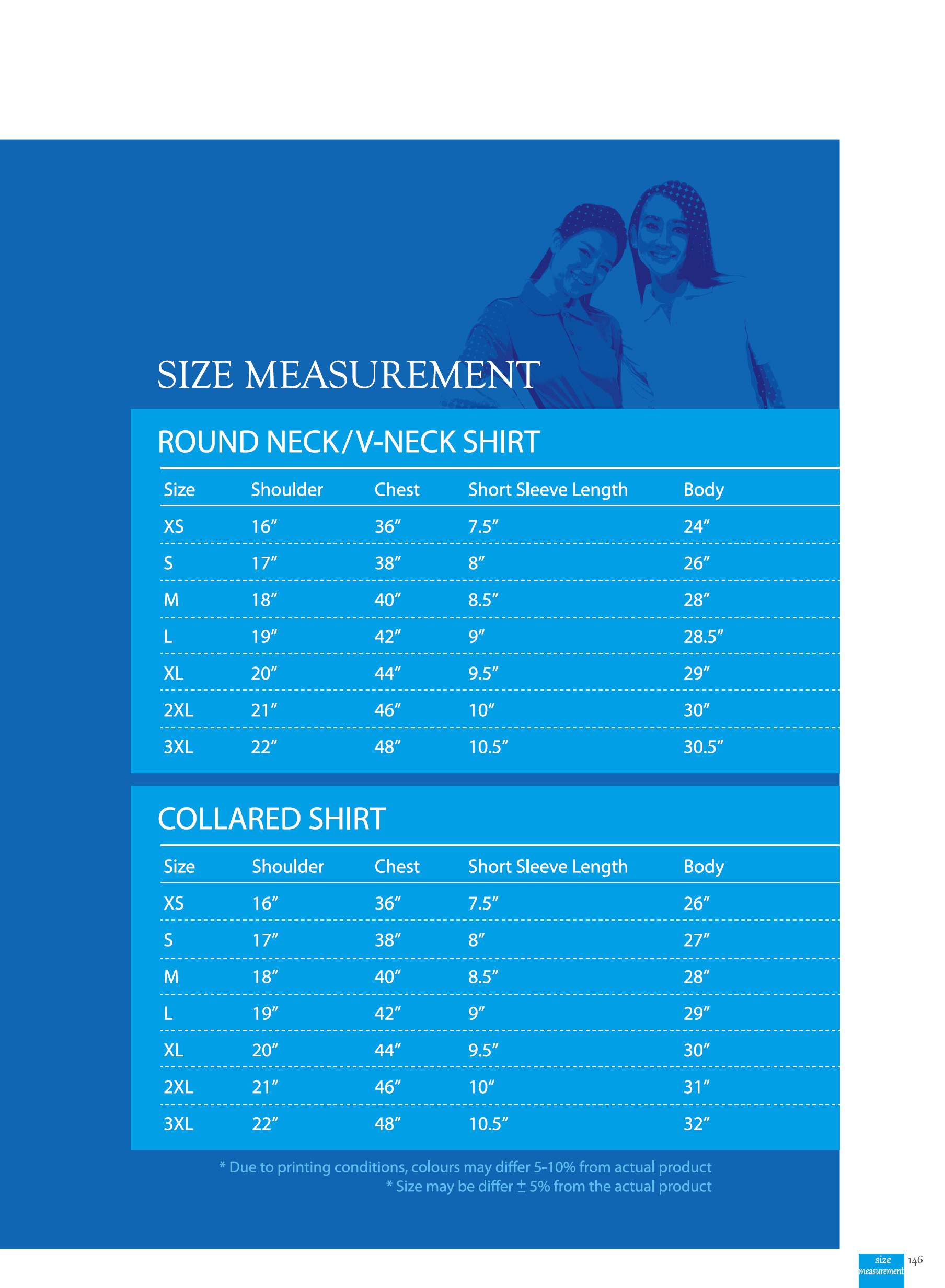 Please refer to charts below for T-Shirts and Uniforms Size Guide. Please take note that size may differs of approx 5%.